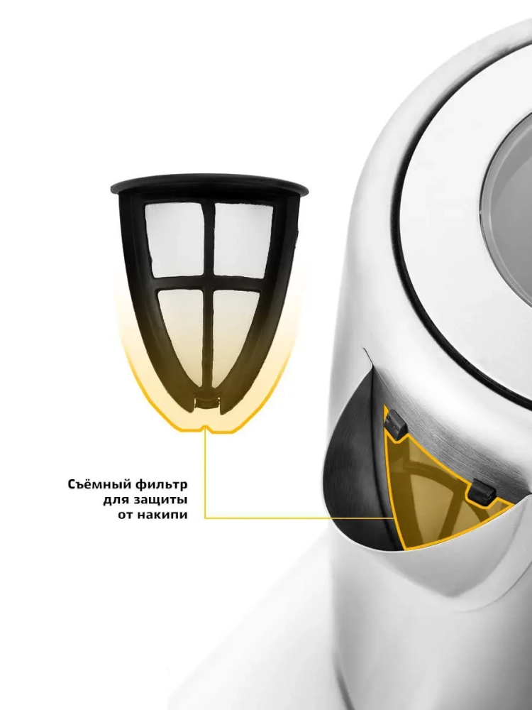 Чайник автоматически отключается при закипании, имеет защиту от перегрева и от включения без воды. В носике чайника расположен съемный фильтр от накипи.
