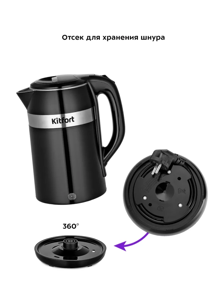 Подставка с центральным контактом дает возможность располагать на ней чайник в любом положении, обеспечивая вращение на 360°. Снизу имеется отсек для хранения шнура, в который можно смотать излишки шнура электропитания, чтобы он не мешал на столе.