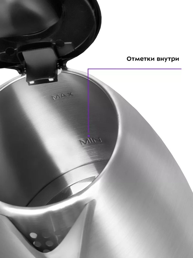 Корпус чайника выполнен из нержавеющей стали и пластика. Крышка и подставка выполнены из пластика. Максимальная и минимальная отметки находятся на внутренней поверхности чайника. Ручка чайника пластиковая, не нагревается и удобно лежит в руке. Внутренняя поверхность чайника полностью состоит из металла, благодаря чему вода не соприкасается с пластиком.