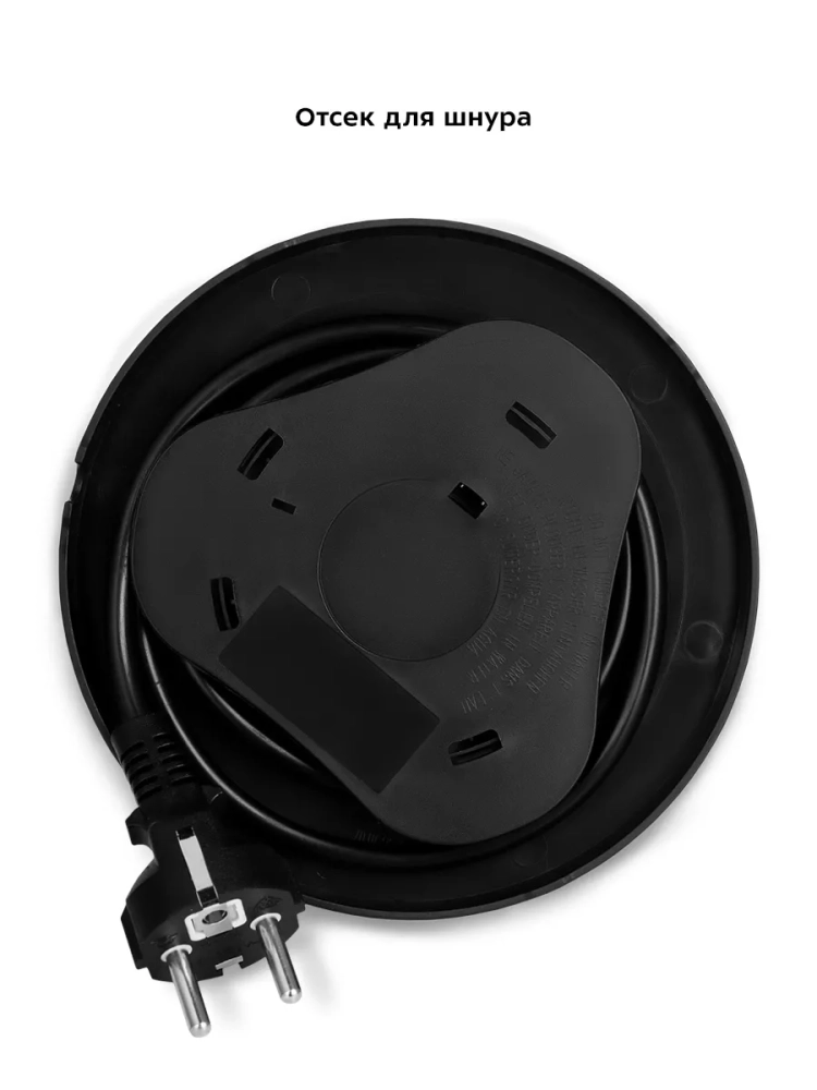 Подставка с центральным контактом дает возможность располагать на ней чайник в любом положении, обеспечивая вращение на 360°. Снизу имеется отсек для хранения шнура, в который можно смотать излишки шнура электропитания, чтобы он не мешал на столе.