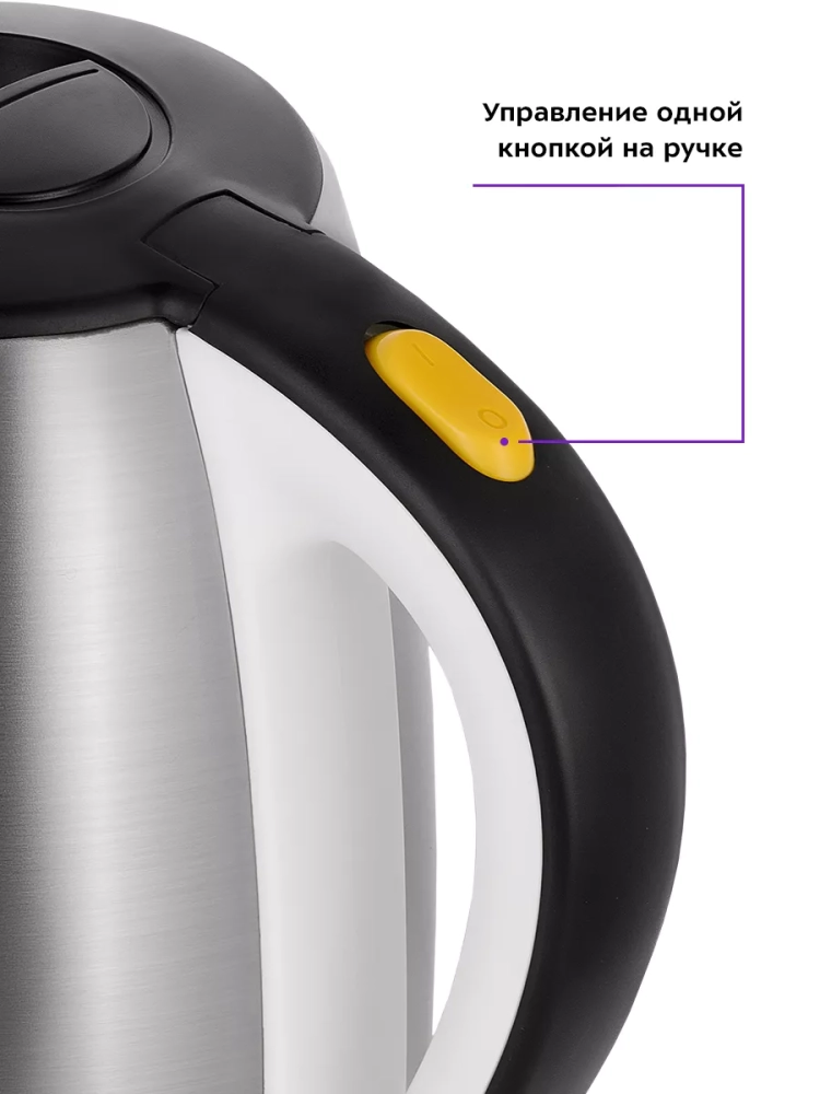 Переключатель расположен на ручке. При включении чайника загорается индикатор.
