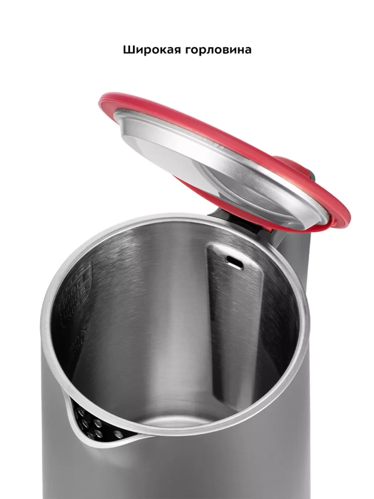 У чайника двойные стенки, благодаря чему вода будет дольше оставаться горячей. Также двойные стенки защищают от ожога, так как не сильно нагреваются. Внешняя часть чайника выполнена из пластмассы. Внутренняя поверхность чайника полностью состоит из нержавеющей стали, благодаря чему вода не соприкасается с пластиком. Крышка также выполнена внутри из нержавеющей стали, а снаружи — из пластмассы. Подставка чайника пластиковая. Отметки «MAX» и «MIN» нанесены на внутреннюю часть чайника. Ручка чайника пластиковая, не нагревается и удобно лежит в руке. При включении чайника загорается подсветка переключателя.