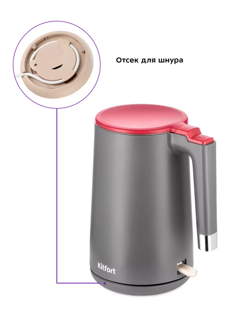 Подставка с центральным контактом дает возможность располагать на ней чайник в любом положении, обеспечивая вращение на 360°. Снизу имеется отсек для хранения шнура, в который можно смотать излишки шнура электропитания, чтобы он не мешал на столе.