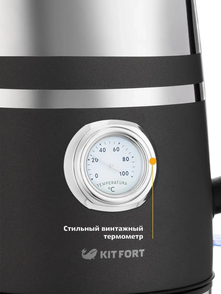 Электрический чайник Kitfort КТ-670 предназначен для кипячения воды дома, в офисах и на дачах. Мощность чайника позволяет использовать его в домах со слабой проводкой. Корпус чайника и подставка выполнен из сочетания металла и пластика, а подставка — из пластика. Мерная шкала находится на корпусе сбоку у ручки. Ручка чайника пластиковая. Она не нагревается и удобно лежит в руке. Кнопка включения/выключения расположена снизу под ручкой, а кнопка открывания крышки — на ручке. Нагревательный элемент (ТЭН) у этой модели чайника скрытый и находится в донной части. Сверху он закрыт специальной металлической пластиной из нержавеющей стали, благодаря которой исключается прямой контакт ТЭНа с водой. Такая конструкция препятствует образованию накипи, облегчает уход и значительно снижает шум при нагревании воды. На корпусе чайника установлен термометр, который показывает температуру воды в чайнике. Это удобно, если вы готовите напитки, для которых требуются определенная температура воды, например, зеленый чай, белый чай, кофе и т. д. Для корректной работы термометра наполняйте чайник водой выше минимального уровня. Подставка с центральным контактом дает возможность располагать на ней чайник в любом положении, обеспечивая вращение на 360°. Чайник Китфорт КТ-670 автоматически отключается при закипании и при снятии с подставки, имеет защиту от перегрева и от включения без воды.
