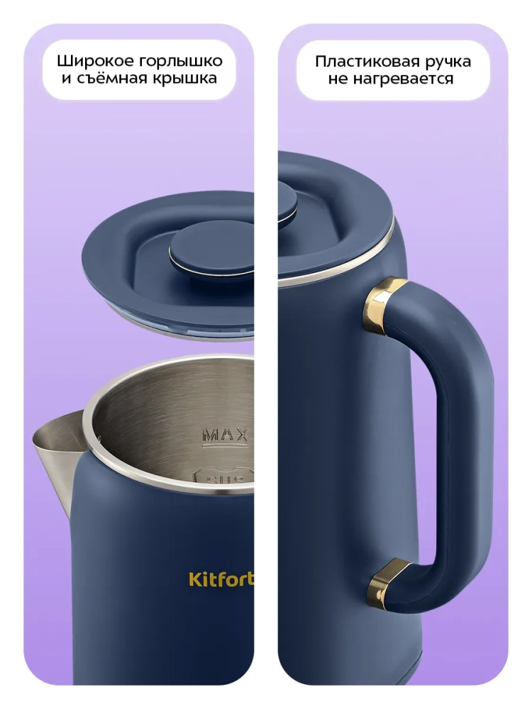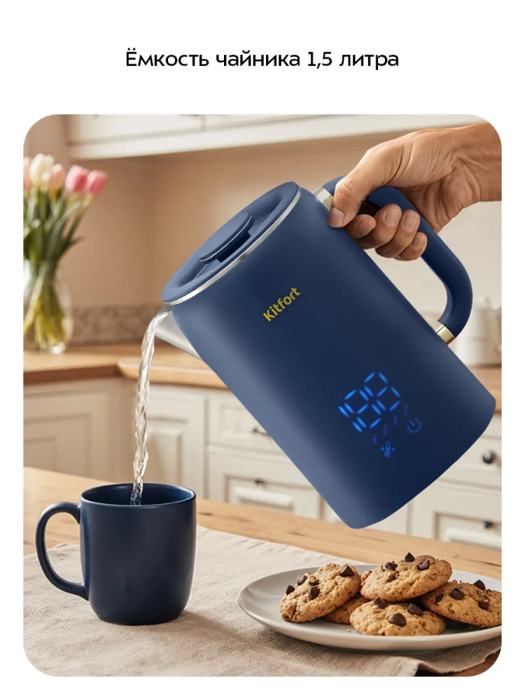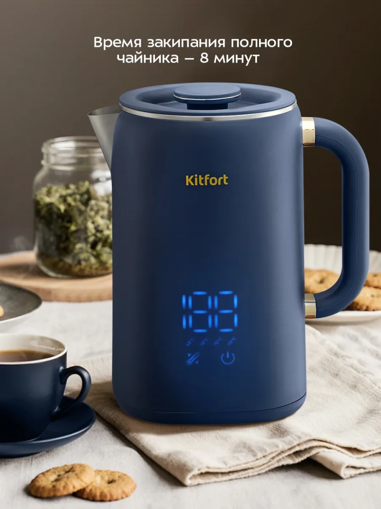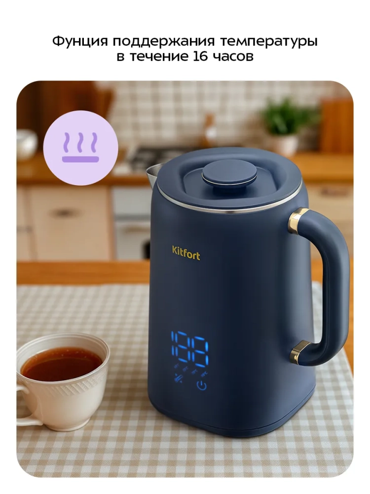 Электрический чайник с электронным терморегулятором Kitfort КТ-6749 может не только вскипятить воду, но и нагреть ее до температуры 45, 55, 70, 85 °С, что очень удобно при заваривании различных сортов чая. Чайник оснащен функцией поддержания температуры в течение 16 часов. Температура воды контролируется встроенным в дно чайника термодатчиком.