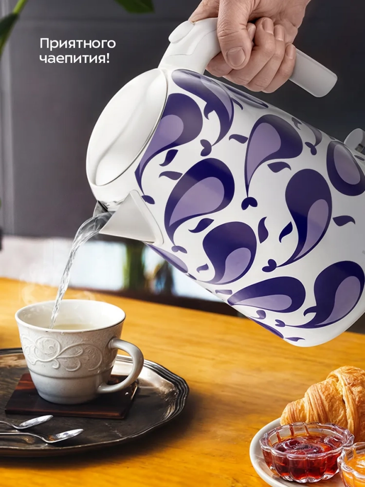 Полный чайник закипает примерно за 6 минут. Чайник автоматически отключается при закипании и снятии с подставки, имеет защиту от перегрева и от включения без воды. Чайник также оснащен фильтром от накипи.