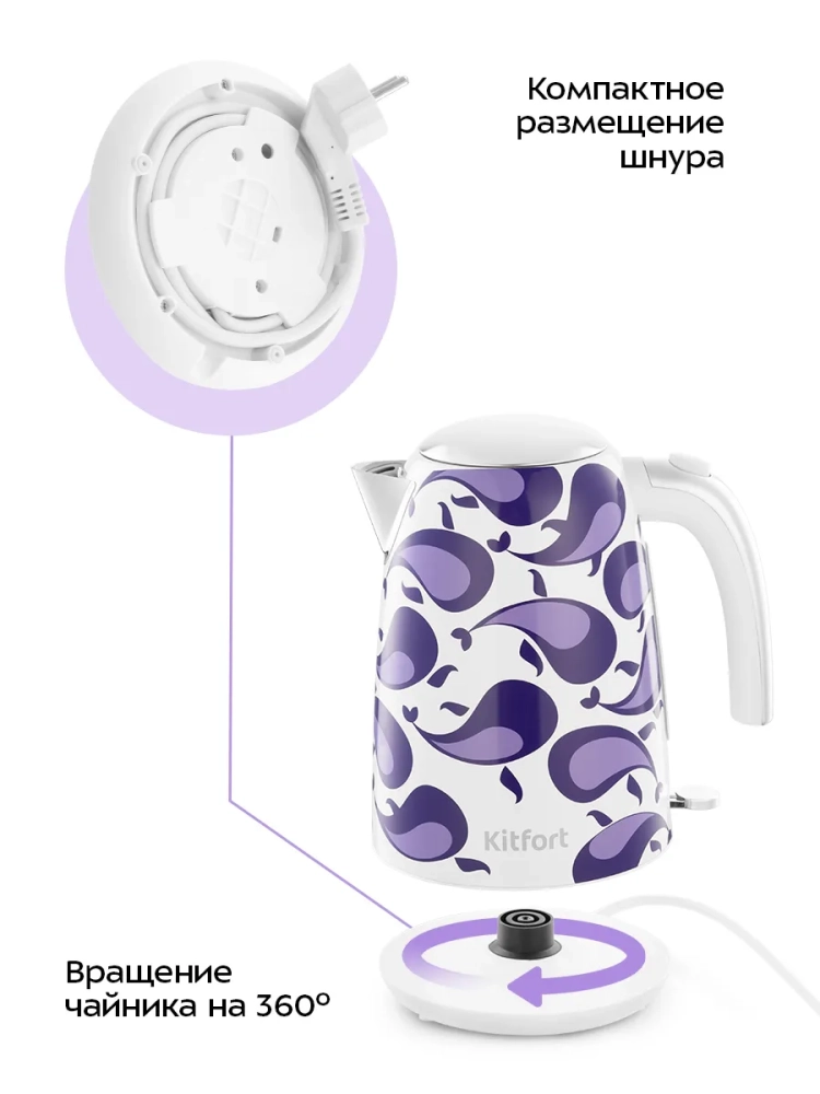 Подставка с центральным контактом дает возможность располагать на ней чайник в любом положении, обеспечивая вращение на 360°. Снизу имеется отсек для хранения шнура, в который можно смотать излишки шнура электропитания, чтобы он не мешал на столе.