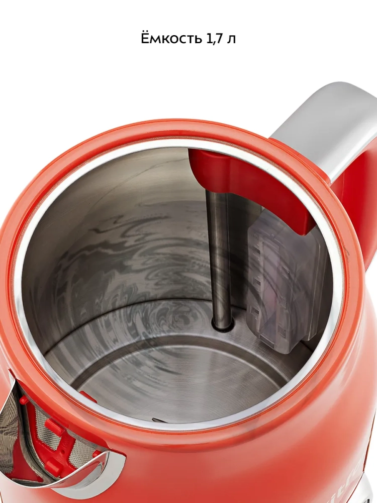 Нагревательный элемент (ТЭН) у этой модели чайника скрытый, он находится в донной части. Сверху он закрыт специальной металлической пластиной из нержавеющей стали, благодаря которой исключается прямой контакт ТЭНа с водой. Такая конструкция препятствует образованию накипи, облегчает уход и значительно снижает шум при нагревании воды.