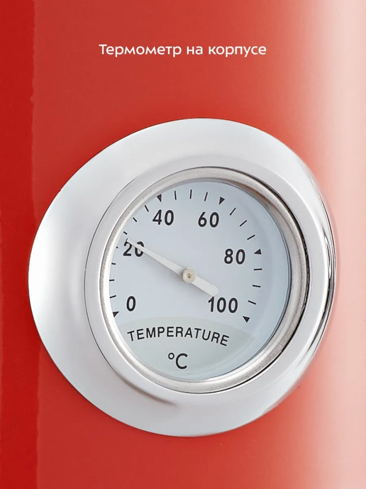 На корпусе чайника расположен термометр биметаллического типа, который показывает температуру воды в чайнике. Это удобно, если вы готовите напитки, для которых требуется определенная температура воды, например, зеленый чай, белый чай, кофе и т. д. Для корректной работы термометра наполняйте чайник водой выше минимального уровня.