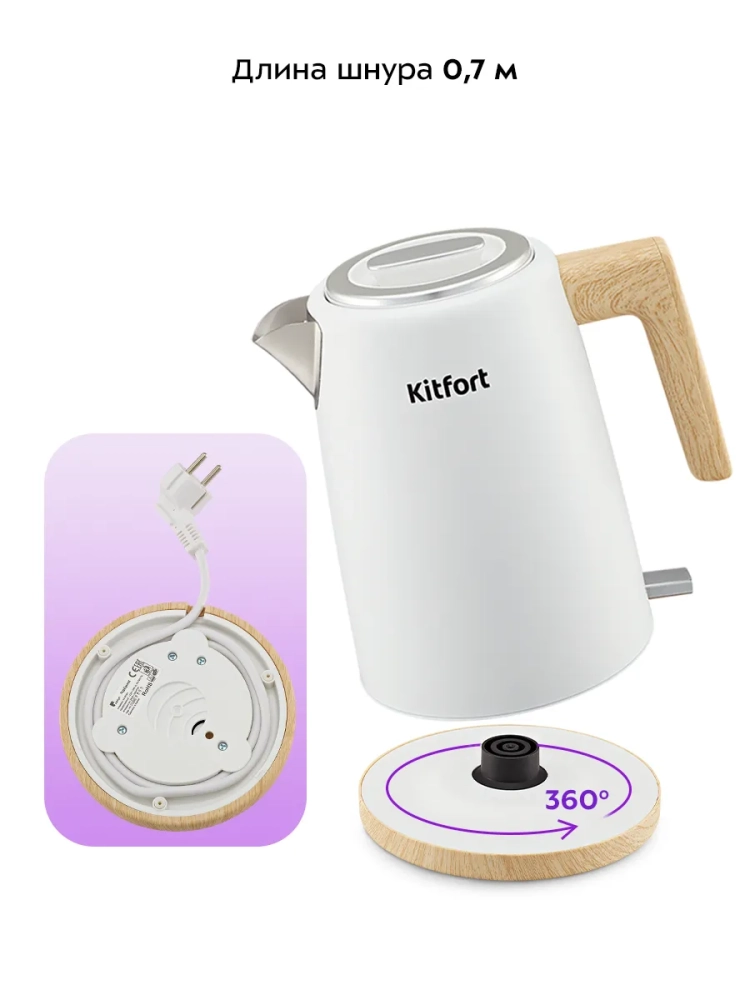 Подставка с центральным контактом дает возможность располагать на ней чайник в любом положении, обеспечивая вращение на 360°. Снизу имеется отсек для хранения шнура, в который можно смотать излишки шнура электропитания, чтобы он не мешал на столе.