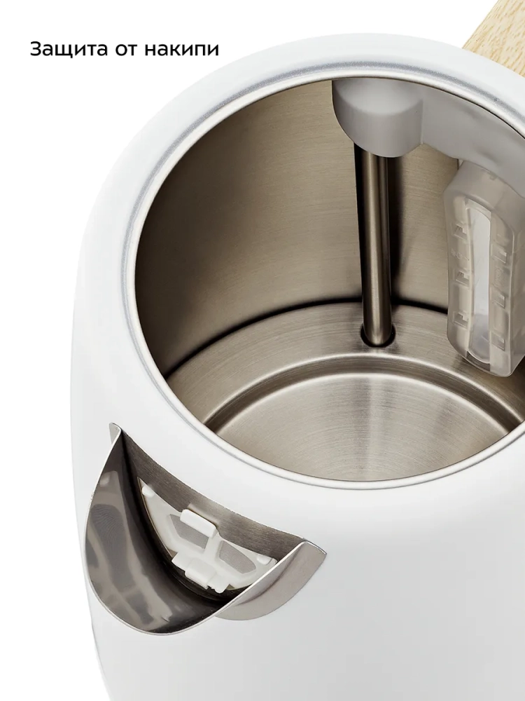 Нагревательный элемент (ТЭН) у этой модели чайника скрытый и находится в донной части. Сверху он закрыт специальной металлической пластиной из нержавеющей стали, благодаря которой исключается прямой контакт ТЭНа с водой. Такая конструкция препятствует образованию накипи, облегчает уход и значительно снижает шум при нагревании воды.