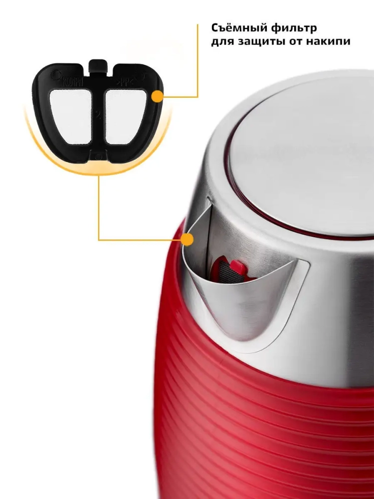 Полный чайник закипит за 5–6 минут. Чайник автоматически отключается при закипании и при снятии с подставки, имеет защиту от перегрева и от включения без воды. В носике чайника расположен съемный фильтр от накипи, выполненный из нейлона.
