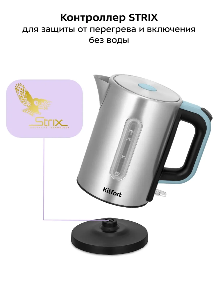 Чайник оснащен контроллером Strix, который отличается своей долговечностью, а также обеспечивает максимальную безопасность при использовании чайника.