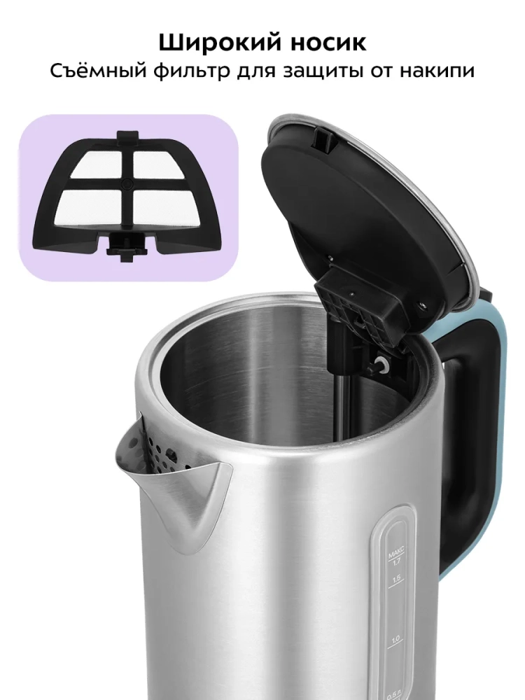 В носике чайника расположен съемный фильтр от накипи.