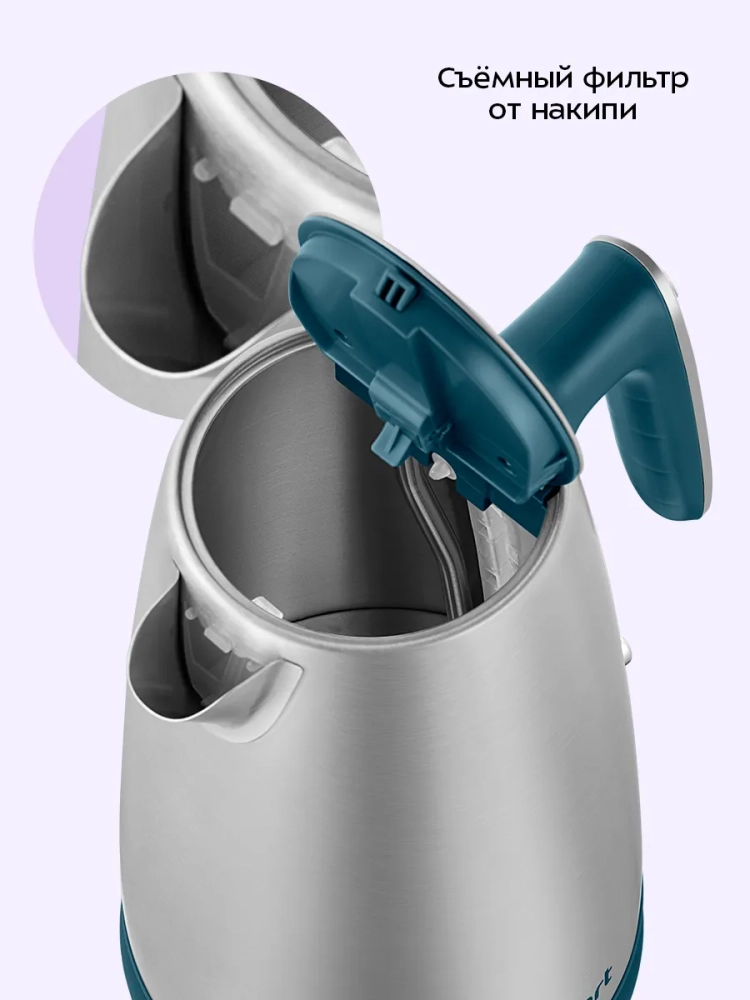Полный чайник закипает примерно за 6 минут. Чайник автоматически отключается при закипании, имеет защиту от перегрева и от включения без воды. В носике чайника расположен съемный фильтр от накипи.