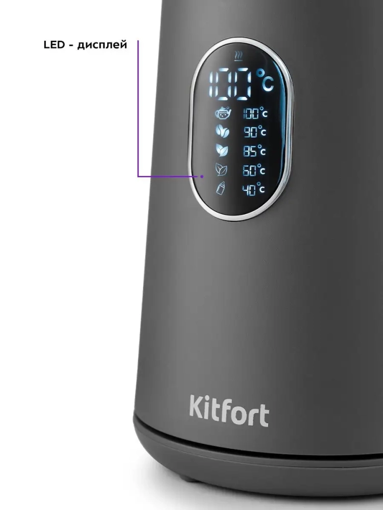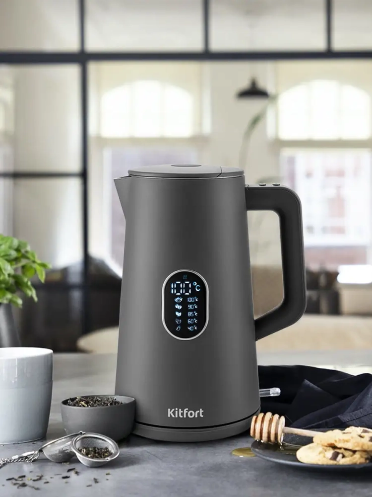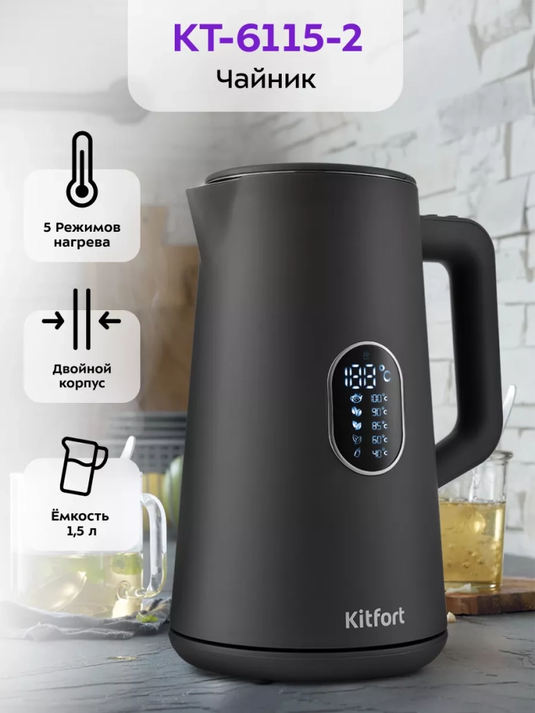Электрический чайник Kitfort КТ-6115 предназначен для нагрева и кипячения воды. Чайник оснащен функцией выбора температуры и может не только вскипятить воду, но и нагреть ее до температуры 40, 60, 85, 90 или 100 °С, что очень удобно при заваривании различных сортов чая, приготовлении кофе и подогрева детского питания. Чайник также оснащен функцией поддержания температуры. Температура воды контролируется термодатчиком, встроенным в дно чайника. Функция поддержания температуры будет держать установленную температуру 24 часа, после чего чайник отключится. Точность поддержания температуры составляет 3 *С.