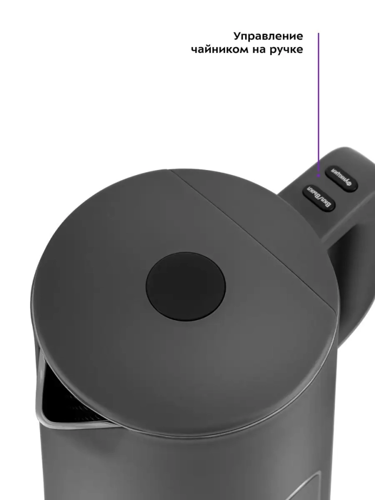 Ручка чайника пластиковая. Она не нагревается и удобно лежит в руке. На ручке расположены кнопки управления чайником, а LED дисплей расположен на боковой стороне чайника. Кнопка открывания крышки расположена на крышке сверху.