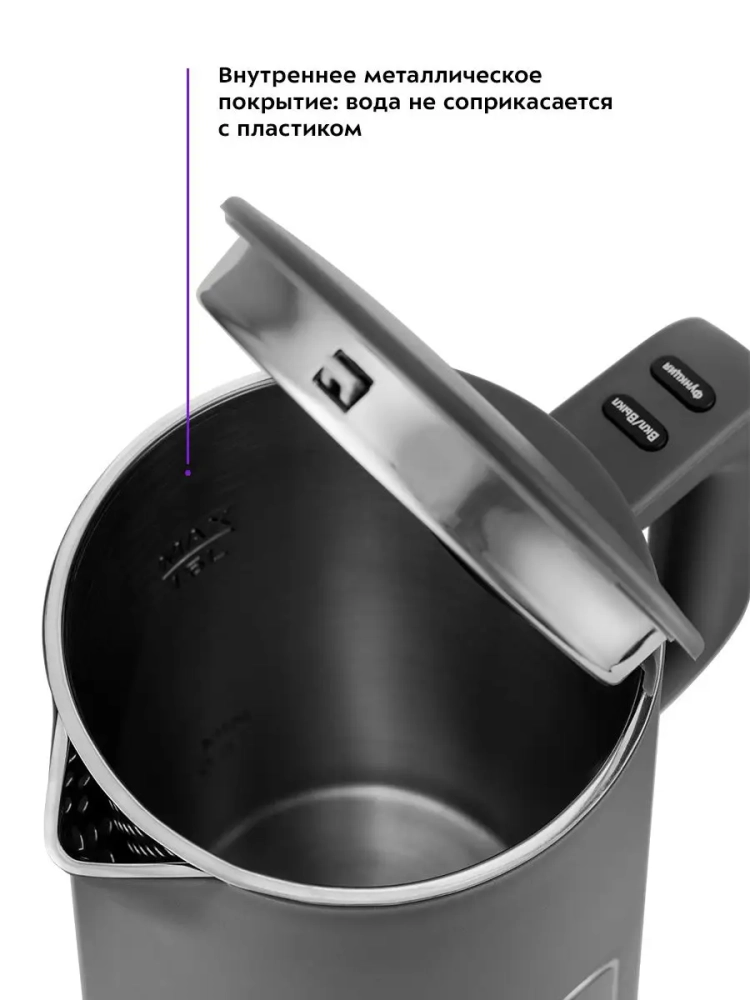 Все внутренние поверхности чайника, соприкасающиеся с водой, выполнены из нержавеющей стали.