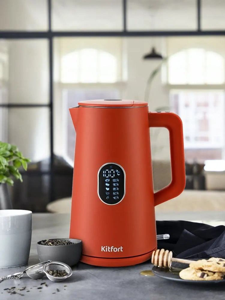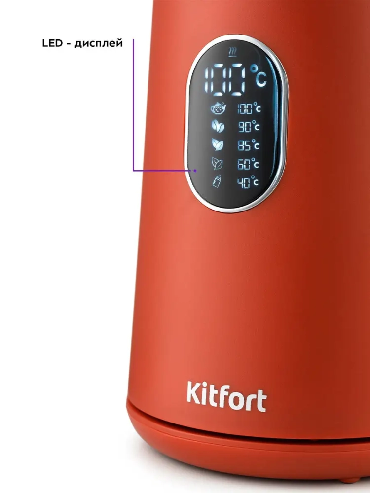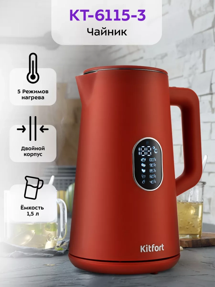 Электрический чайник Kitfort КТ-6115 предназначен для нагрева и кипячения воды. Чайник оснащен функцией выбора температуры и может не только вскипятить воду, но и нагреть ее до температуры 40, 60, 85, 90 или 100 °С, что очень удобно при заваривании различных сортов чая, приготовлении кофе и подогрева детского питания. Чайник также оснащен функцией поддержания температуры. Температура воды контролируется термодатчиком, встроенным в дно чайника. Функция поддержания температуры будет держать установленную температуру 24 часа, после чего чайник отключится. Точность поддержания температуры составляет 3 *С.