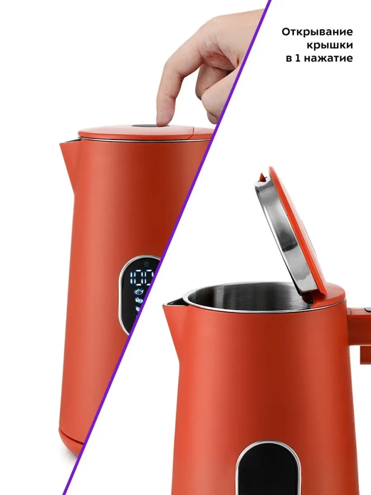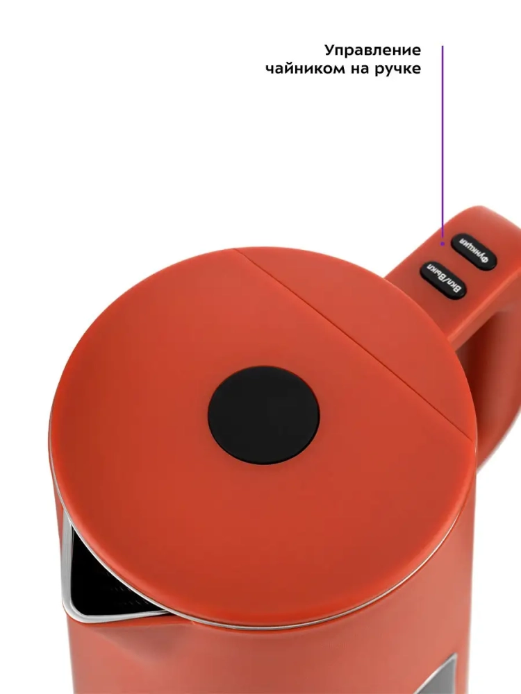 Ручка чайника пластиковая. Она не нагревается и удобно лежит в руке. На ручке расположены кнопки управления чайником, а LED дисплей расположен на боковой стороне чайника. Кнопка открывания крышки расположена на крышке сверху.