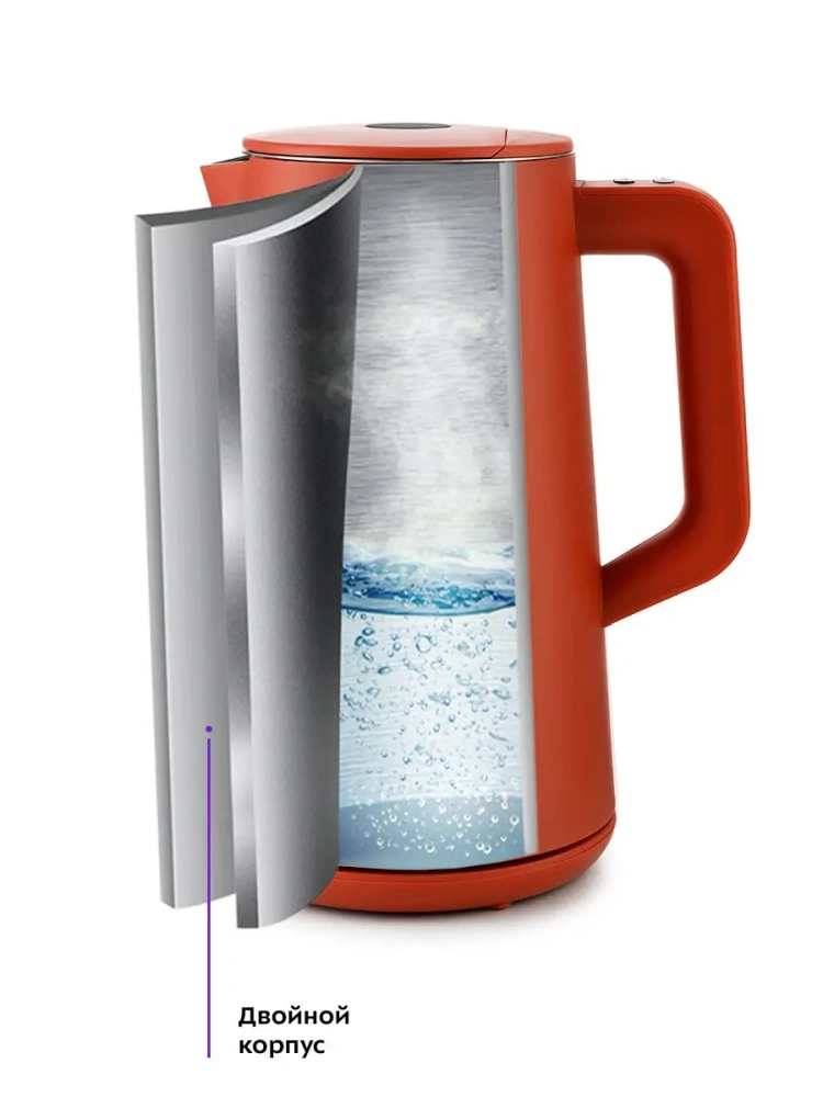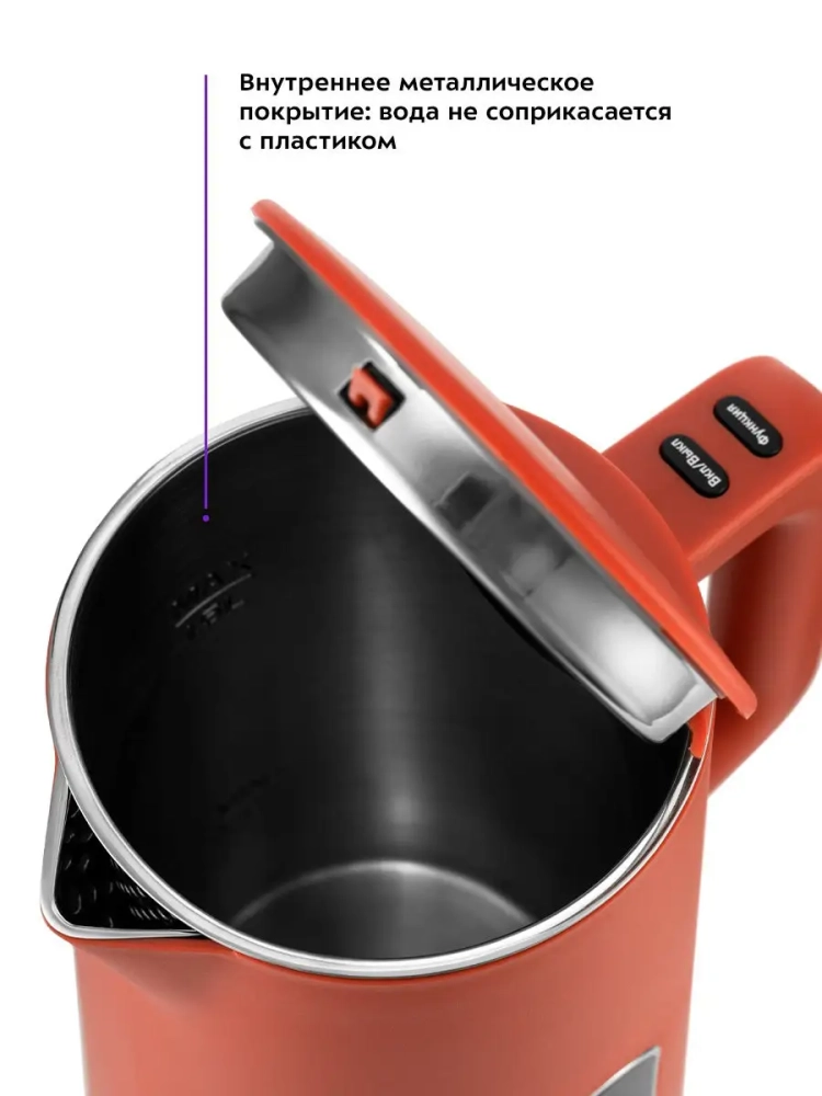 Все внутренние поверхности чайника, соприкасающиеся с водой, выполнены из нержавеющей стали.