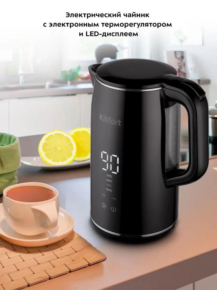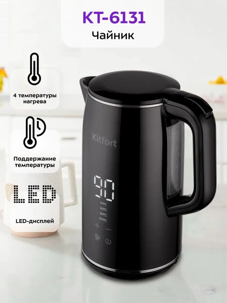 Электрический чайник с электронным терморегулятором Kitfort КТ-6131 может не только вскипятить воду, но и нагреть ее до температур: 40, 60, 90 °С, что очень удобно при заваривании различных сортов чая. Температура 40 °С удобна для приготовления детского питания. Чайник оснащен функцией поддержания температуры. Температура воды контролируется встроенным в дно чайника термодатчиком.