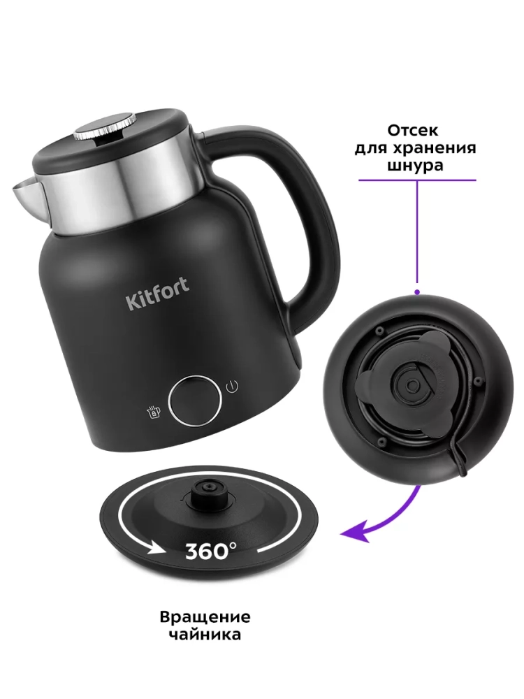 Подставка с центральным контактом дает возможность располагать на ней чайник в любом положении, обеспечивая вращение на 360 °. Снизу имеется отсек для хранения шнура, в который можно смотать излишки шнура электропитания, чтобы он не мешал на столе.