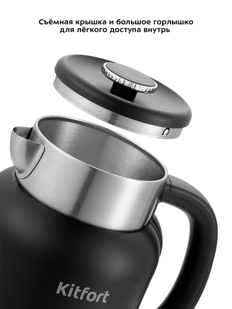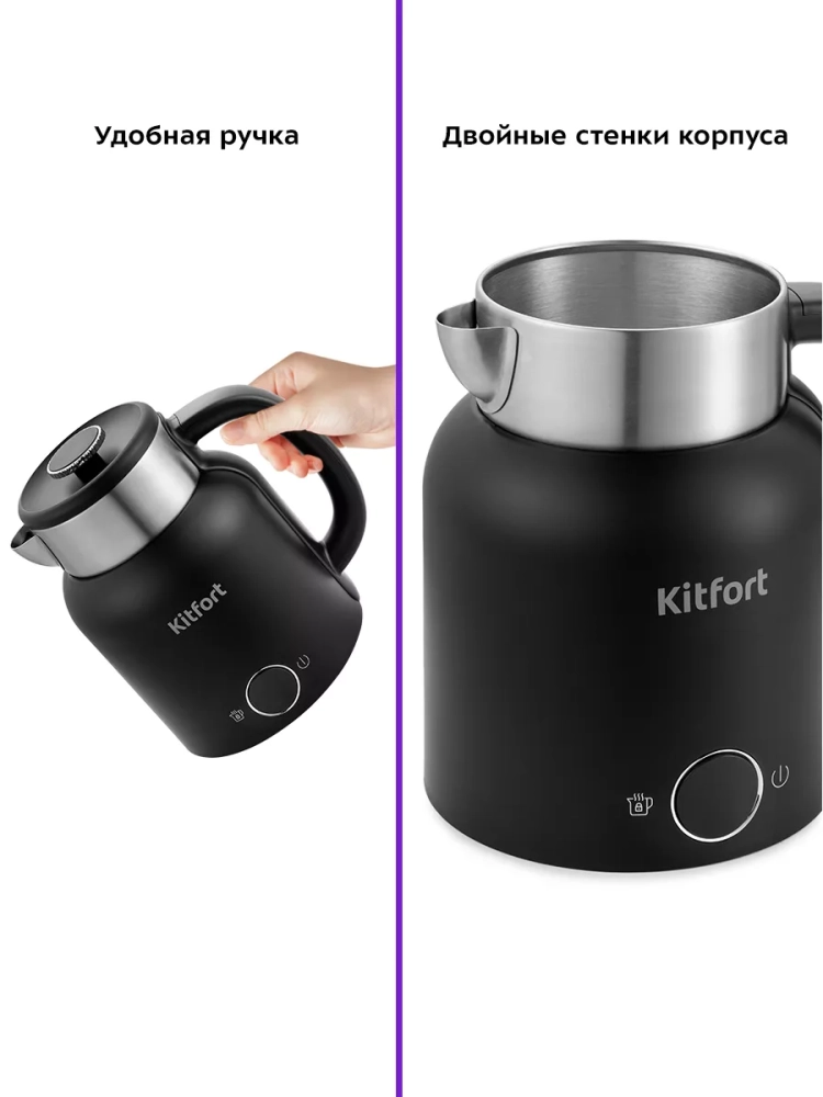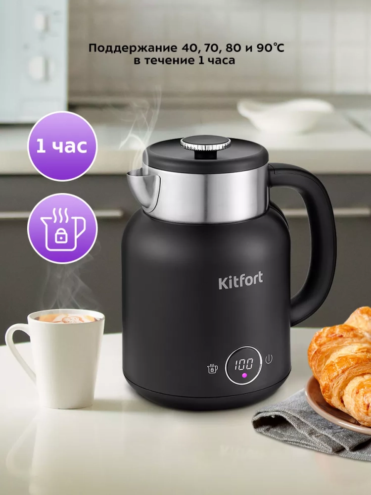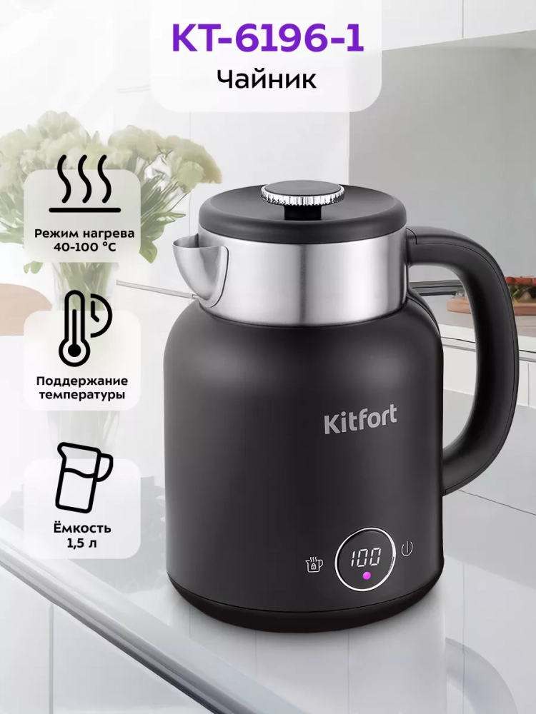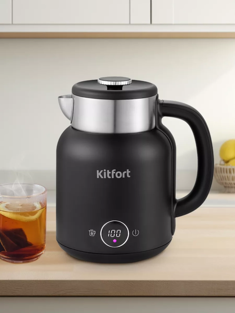 Электрический чайник с электронным терморегулятором Kitfort КТ-6196 может не только вскипятить воду, но и нагреть ее до температур: 45, 55, 65, 75 и 85 °С, что очень удобно при заваривании различных сортов чая. Температура 45 °С удобна для приготовления детского питания. Чайник также оснащен функцией поддержания температуры. Температура воды контролируется встроенным в дно чайника термодатчиком.