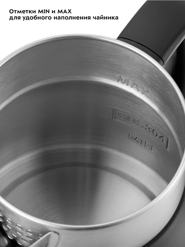 Нагревательный элемент (ТЭН) у этой модели чайника скрытый и находится в донной части. Сверху он закрыт специальной металлической пластиной из нержавеющей стали, благодаря которой исключается прямой контакт ТЭНа с водой. Такая конструкция препятствует образованию накипи, облегчает уход и значительно снижает шум при нагревании воды.