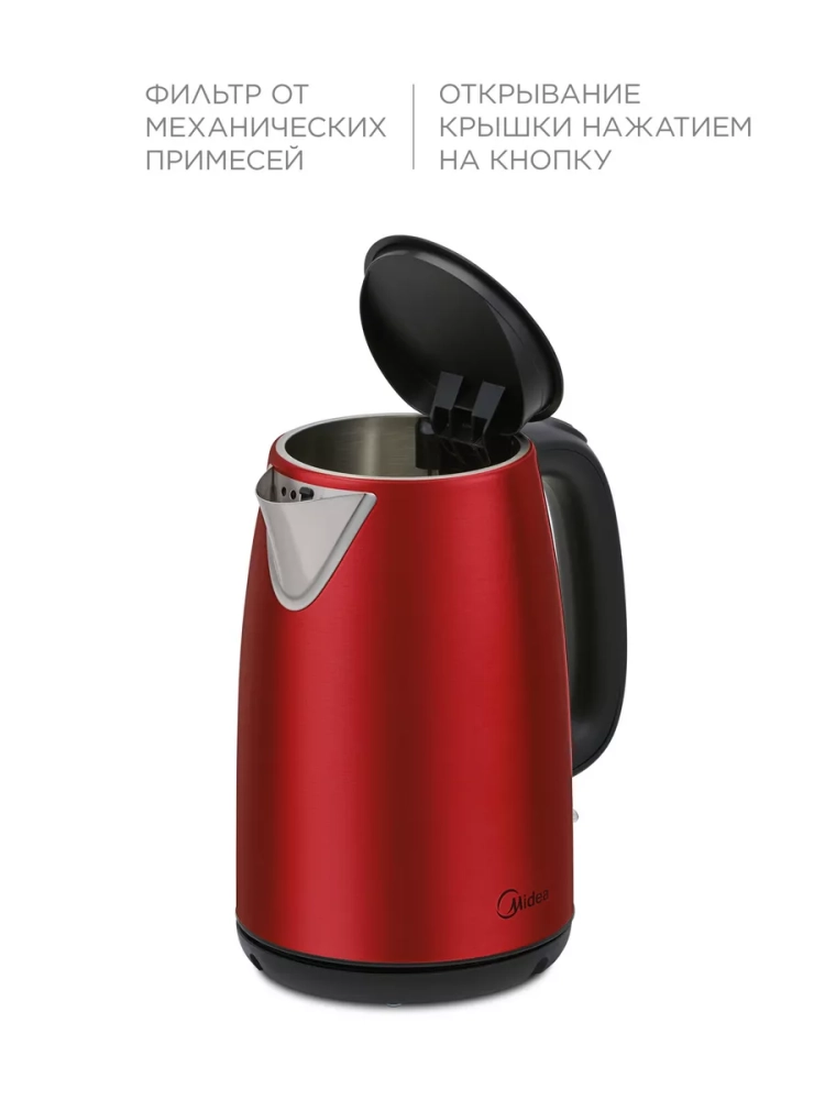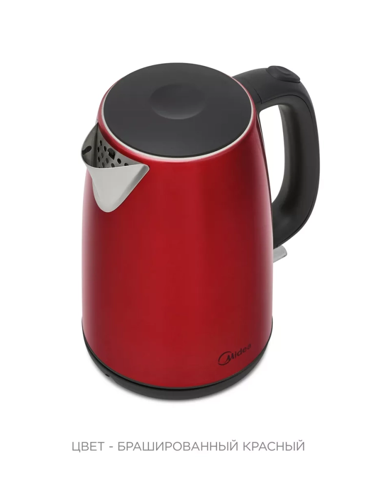 Корпус чайника выполнен из нержавеющей стали, что гарантирует долговечность и надежность устройства. Красный матовый цвет корпуса придает чайнику стильный и современный вид. Чайник Midea MK-8022 также оснащен вращающейся на 360 градусов подставкой, что позволяет удобно разместить его на любой поверхности. Отсек для хранения шнура обеспечивает компактное хранение устройства.
