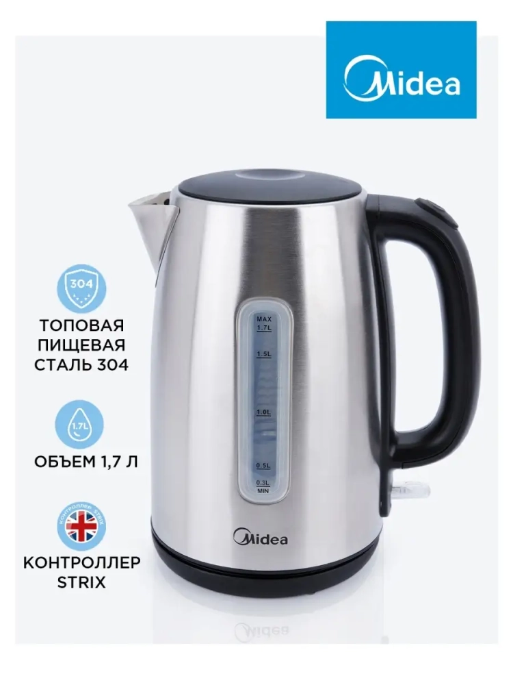 Электрический чайник Midea MK-8028 мощностью 1850-2200 Вт с корпусом из пищевой нержавеющей стали топовой марки SS304. Увеличенный угол открытия крышки. Носик, внутренняя колба и крышка выполнена из нержавеющей стали. Увеличенный диаметр и конструкция колбы позволяют легко чистить чайник. Объем чайника 1,7 л. Съемный фильтр. Крышка открывается автоматически при нажатии кнопки на ручке. Надежный британский контроллер Strix обеспечивает до 15 000 включений. Длина шнура 80 см. Цвет корпуса -серый.