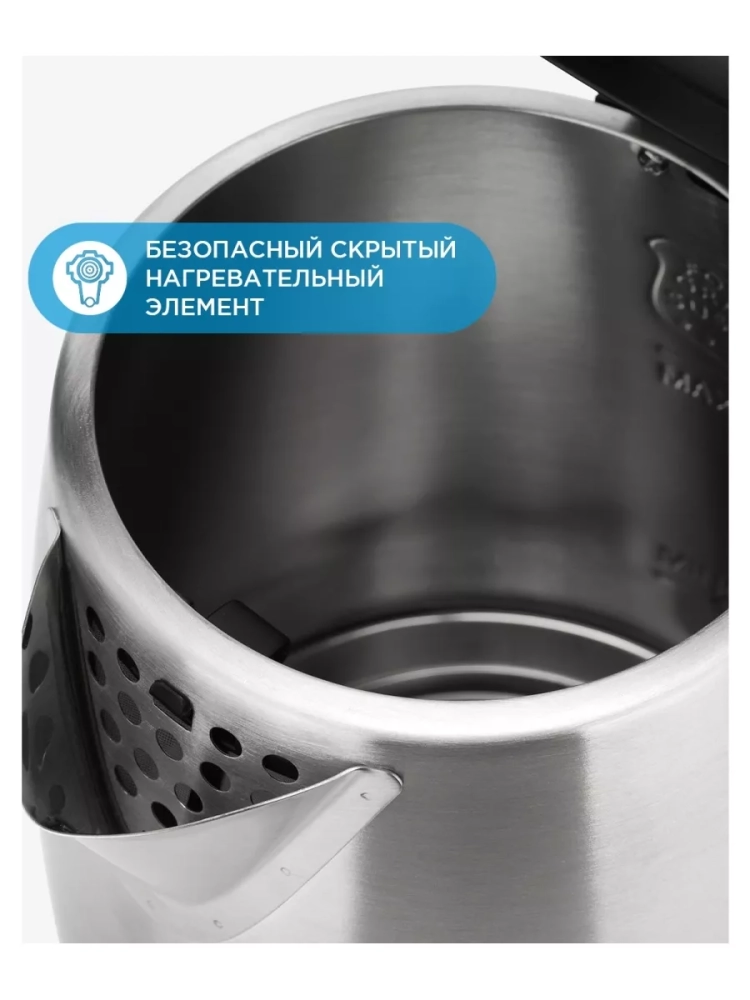 Корпус и нагревательный элемент чайника выполнен из нержавеющей стали, что гарантирует долговечность и надежность устройства, равномерный нагрев воды и безопасность использования. Безопасность использования чайника также обеспечивается блокировкой включения без воды и отключением при снятии с подставки.