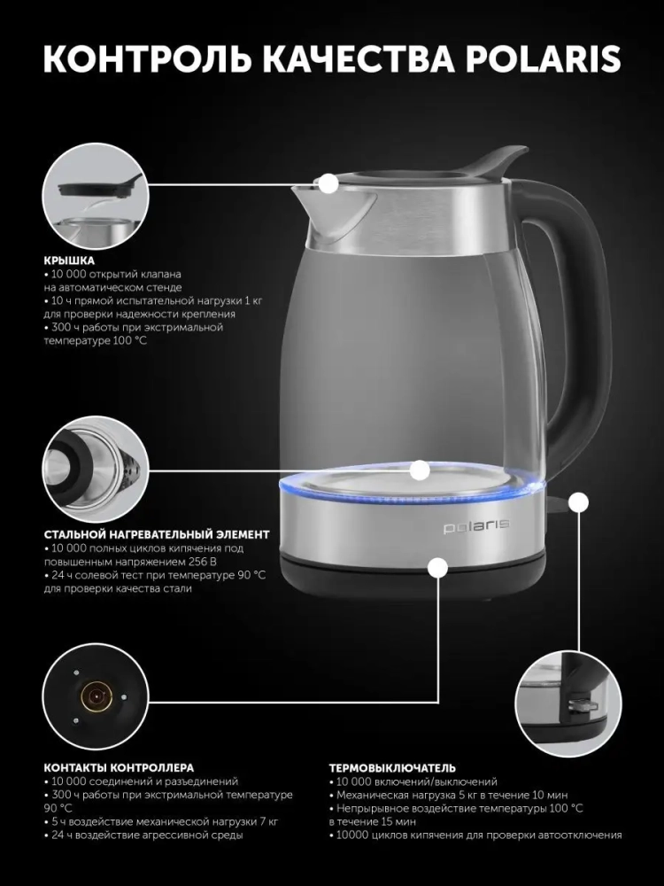 Чайник Polaris выполнен из высококачественного термостойкого стекла, которое прошло инструментальную проверку на однородность и чистоту. Внутренняя подсветка добавляет устройству яркий визуальный акцент, делая его привлекательным дополнением интерьера. Английский контроллер STRIX рассчитан на 15 000 циклов кипячения, что гарантирует долгий срок службы – до 10 лет активного использования.