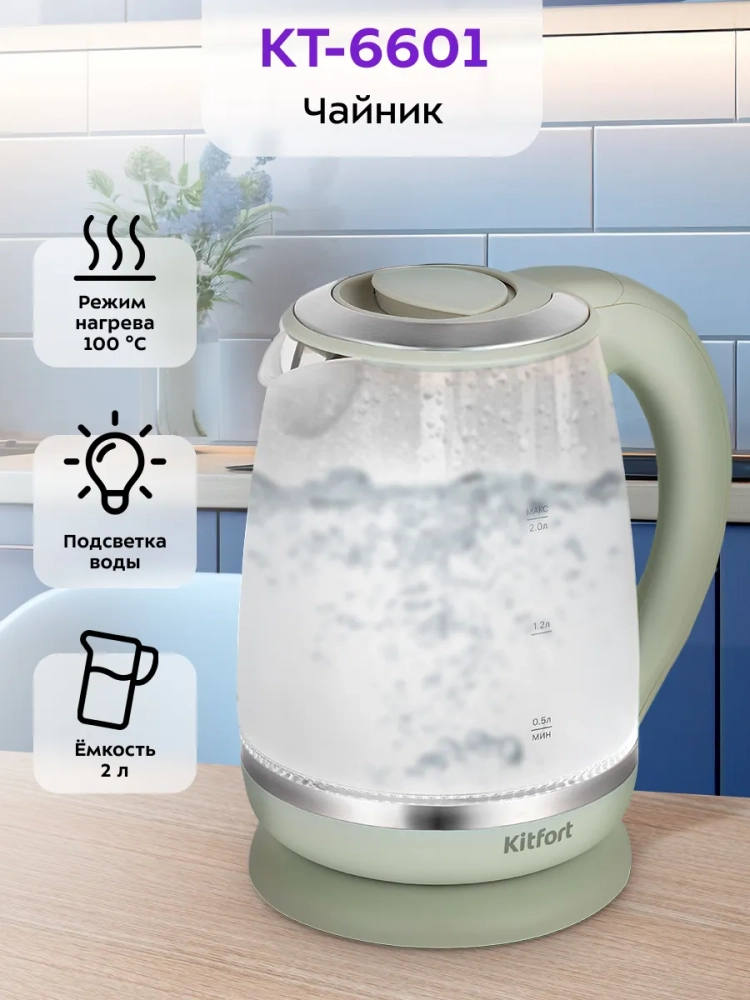 Электрический чайник Kitfort КТ-6601 предназначен для кипячения воды дома, в офисе, на даче. Мощность чайника позволяет использовать его в домах со слабой проводкой.