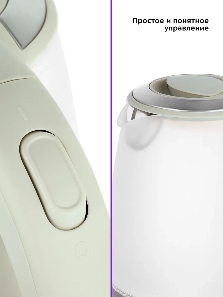 Чайник автоматически отключается при закипании и при снятии с подставки, имеет защиту от перегрева и от включения без воды.