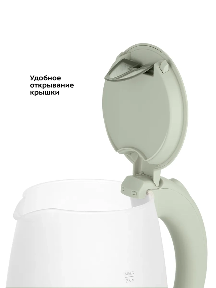 Корпус чайника выполнен из стекла, а крышка и подставка — из пластмассы. Мерная шкала нанесена на прозрачную часть корпуса. Большое горлышко чайника облегчает доступ внутрь при мытье и во время удаления накипи. Ручка чайника пластиковая, не нагревается и удобно лежит в руке.