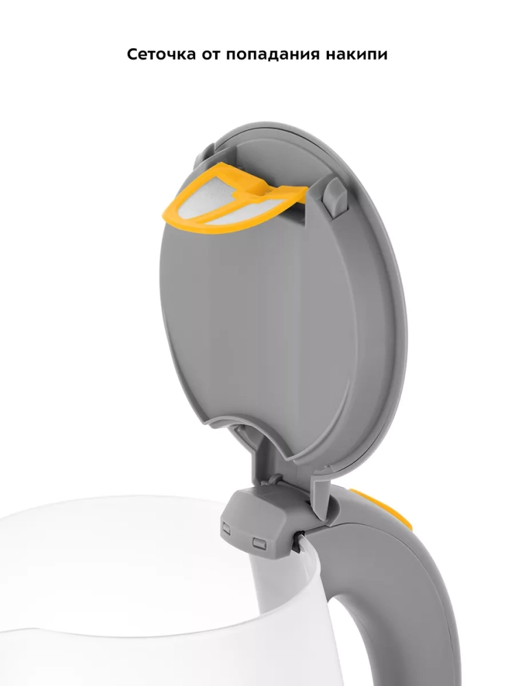 Корпус чайника выполнен из стекла, а крышка и подставка — из пластмассы. Мерная шкала нанесена на прозрачную часть корпуса. Большое горлышко чайника облегчает доступ внутрь при мытье и во время удаления накипи. Ручка чайника пластиковая, не нагревается и удобно лежит в руке.