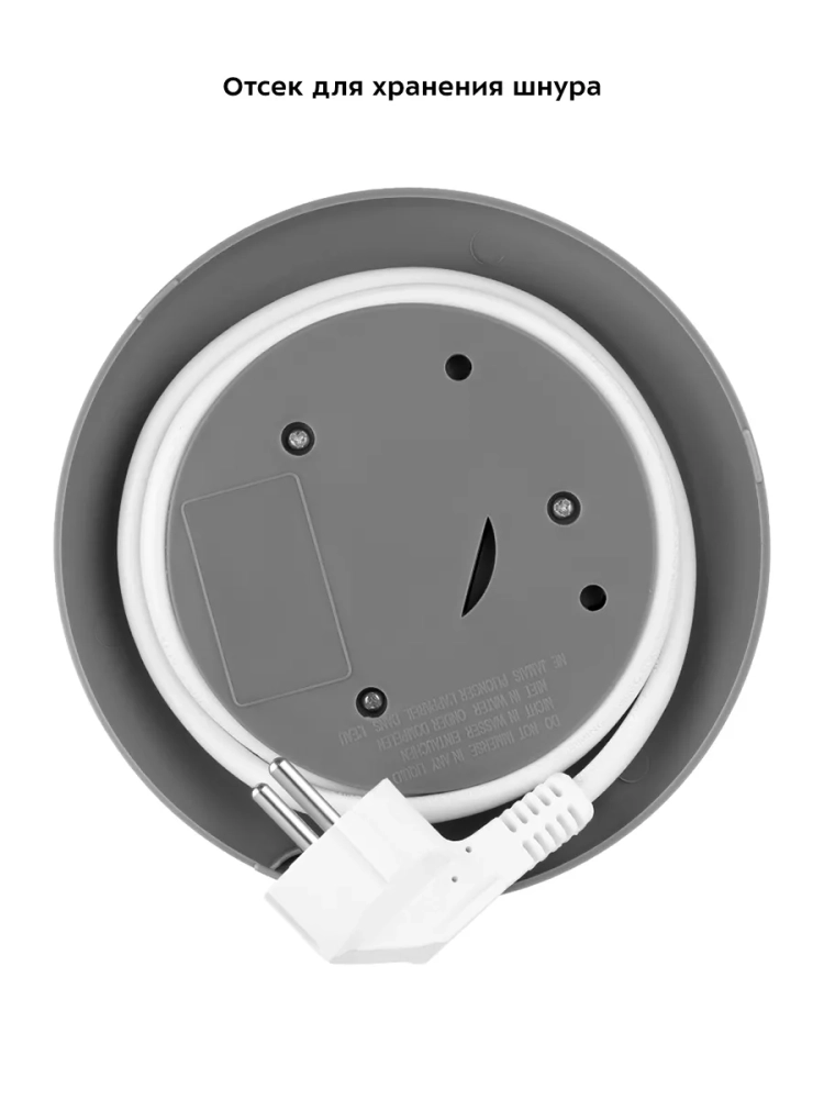 Подставка с центральным контактом дает возможность располагать на ней чайник на нее в любом положении, обеспечивая вращение на 360°. Снизу имеется отсек для хранения шнура, в который можно смотать излишки шнура электропитания, чтобы он не мешался на столе.