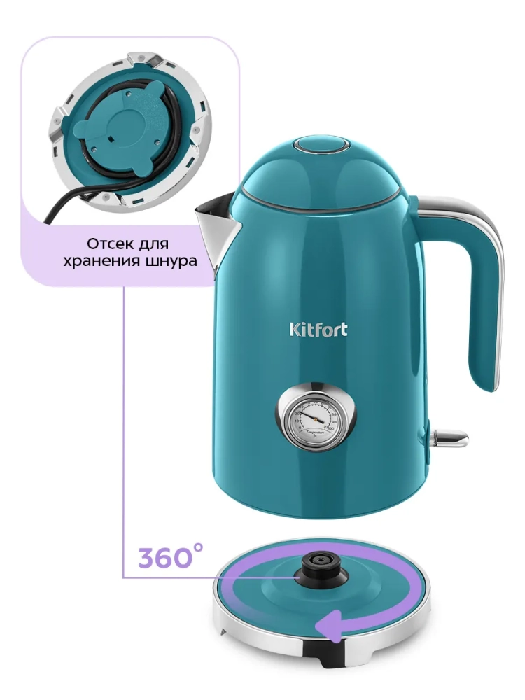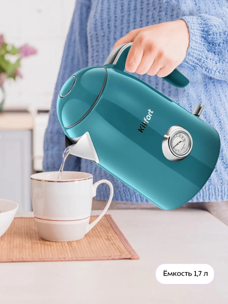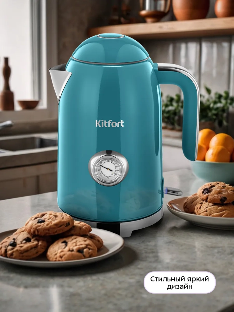 Электрочайник с термометром 1.7 литра KT-6740 от Kitfort — это идеальное решение для вашего дома, офиса или дачи. Этот электрический чайник сочетает в себе стильный дизайн и высокую функциональность, что делает его незаменимым бытовым прибором. Корпус выполнен из нержавеющей стали, что придаёт ему долговечность и современный внешний вид. Металлический корпус не только прочен, но и устойчив к коррозии. Чайник оснащён встроенным термометром на корпусе, который позволяет контролировать температуру воды в любой момент времени. Это особенно удобно для приготовления различных напитков, требующих определённой температуры заваривания. Емкость составляет 1,7 литра — оптимальный объём для использования всей семьёй или небольшой компанией друзей. Подсветка кнопки включения/выключения служит индикатором работы устройства и добавляет дополнительный элемент стиля вашему кухонному пространству. Пластиковая ручка не нагревается во время работы прибора и обеспечивает комфортное использование. Электрочайник автоматически отключается при закипании воды благодаря встроенной защите от перегрева и включения без воды — это гарантирует безопасность эксплуатации в любых условиях. Контроллер Strix обеспечивает надёжную работу устройства на протяжении долгого времени. С мощностью 1850–2200 Вт этот электрический чайник значительно сокращает время нагрева по сравнению с традиционными плитами, экономя ваше время каждый день. Чайник Kitfort КТ-6740 станет отличным дополнением к вашей бытовой технике благодаря своей эффективности и современному дизайну.