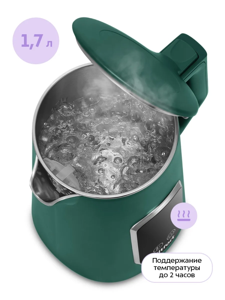 Электрический чайник Kitfort КТ-8726 предназначен для кипячения воды дома, в офисе, на даче. Прибор также может нагреть воду до температуры 45, 55, 75, 85 или 90 °С и поддерживать заданную температуру в течение 2 часов. Температура воды контролируется встроенным в дно чайника термодатчиком.