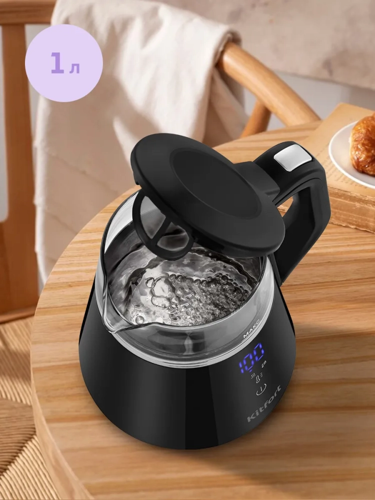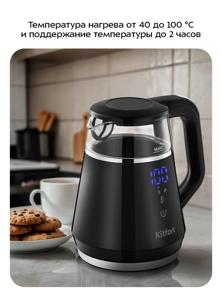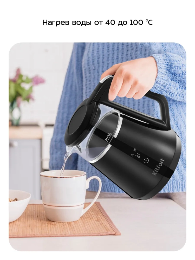 Электрический чайник с электронным терморегулятором Kitfort КТ-6696 может не только вскипятить воду, но и нагреть ее до 40, 70, 80 и 90 °С, что очень удобно при заваривании различных сортов чая. Чайник также оснащен функцией поддержания температуры в течение 2 часов. Температура воды контролируется встроенным термодатчиком.