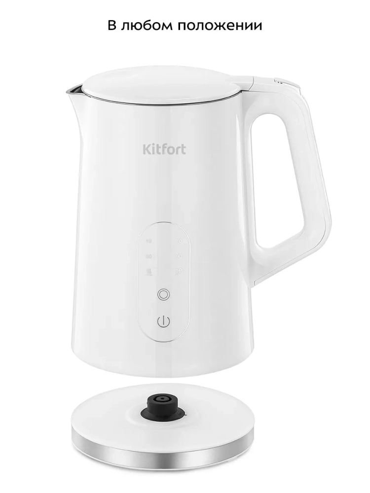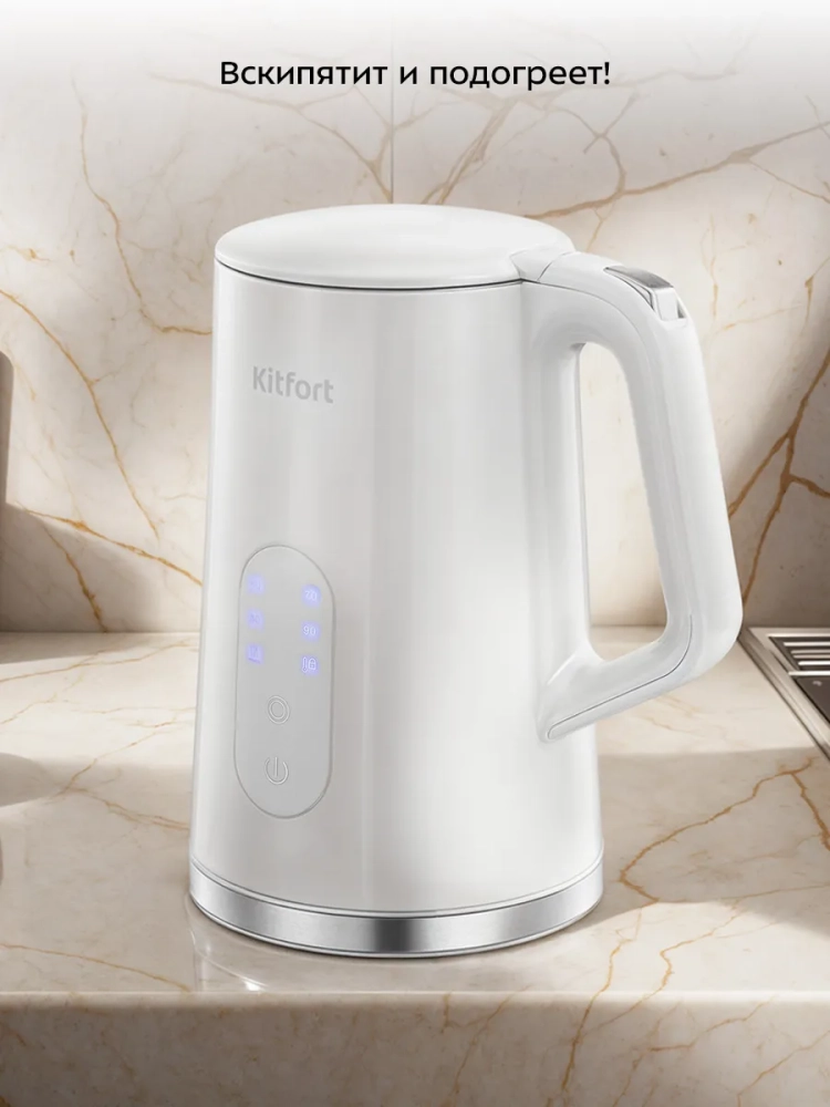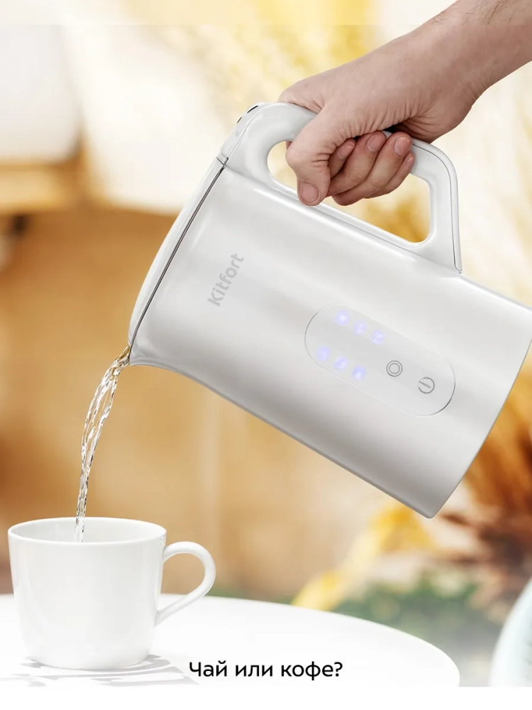 Электрический чайник с электронным терморегулятором Kitfort КТ-6702 может не только вскипятить воду, но и нагреть ее до 40, 70, 80 и 90 °С, что очень удобно при заваривании различных сортов чая. Чайник также оснащен функцией поддержания температуры в течение 2 часов. Температура воды контролируется встроенным термодатчиком.