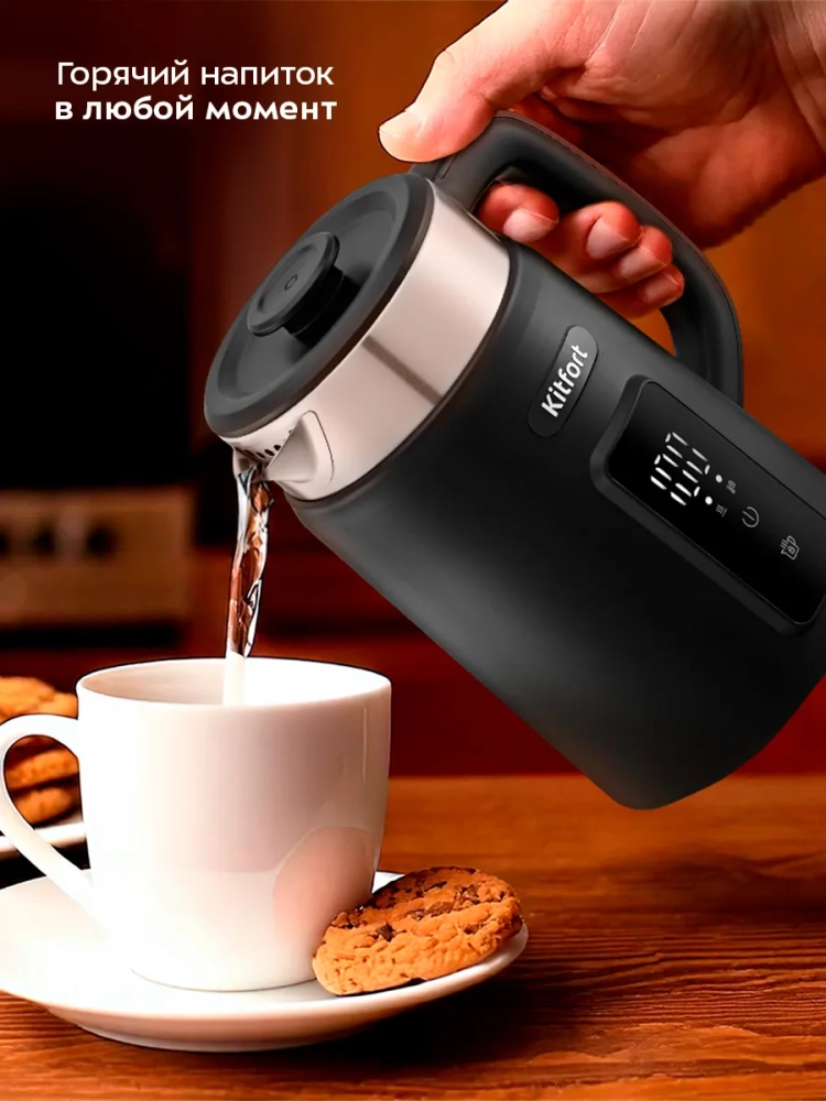 Электрический чайник с электронным терморегулятором Kitfort КТ-6716 может не только вскипятить воду, но и нагреть ее до температуры в диапазоне от 40 до 90 °С с шагом 10 °С, что очень удобно при заваривании различных сортов чая. Чайник также оснащен функцией поддержания температуры в течение 2 часов. Температура воды контролируется встроенным в дно чайника термодатчиком.