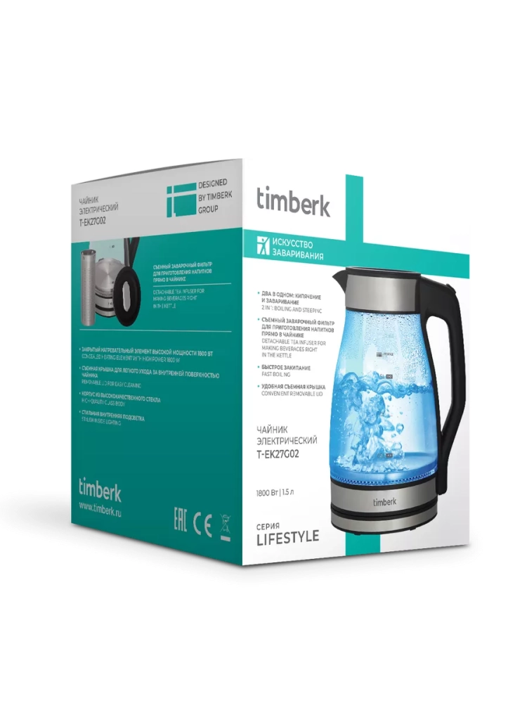 Чайник Timberk T-EK27G02 совмещает в себе две функции: кипячение и заваривание. Корпус чайника выполнен из высококачественного термостойкого стекла. Съемная крышка облегчит уход за внутренней поверхностью чайника, а также сделает комфортным процесс залива воды. Чайник оснащён системой защиты от сухого кипячения, если в чайнике нет или мало воды, он автоматически отключится. В комплект прибора входят база питания с отсеком для хранения шнура, съемный заварочный фильтр.