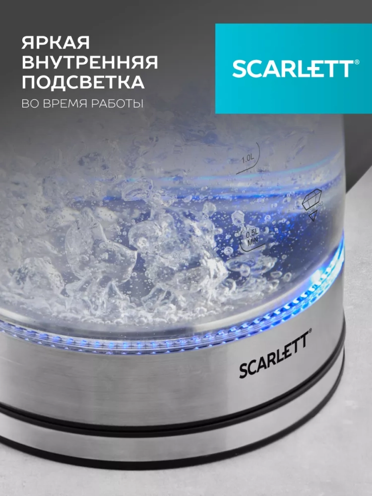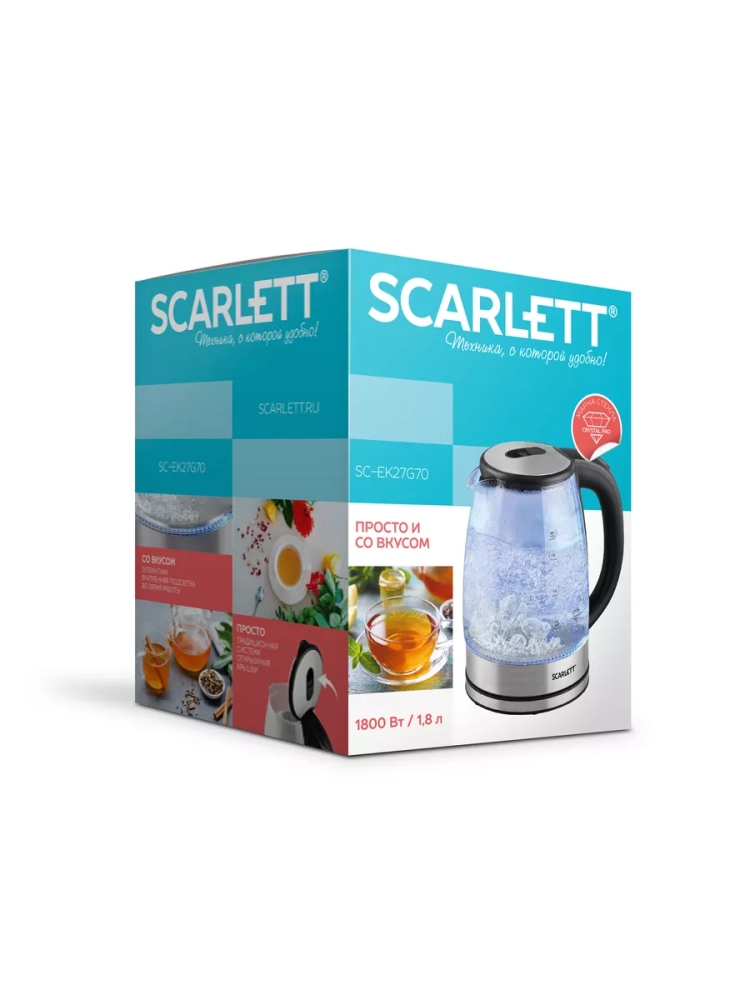 Электрочайник стеклянный с подсветкой Scarlett SC-EK27G70 обеспечивает надежное и безопасное использование. Чайник электрический стеклянный с подсветкой 1,8 л позволяет удобно пользоваться прибором даже при слабом освещении. Объём чайника составляет 1,8 литра. Индикатор уровня воды поможет контролировать остаток воды в чайнике. Шнур удобно убирается в специальный отсек в базе прибора. Система безопасности Safe Work – автоматическое отключение при закипании воды, защита от включения при отсутствии воды в электрочайник стеклянный.