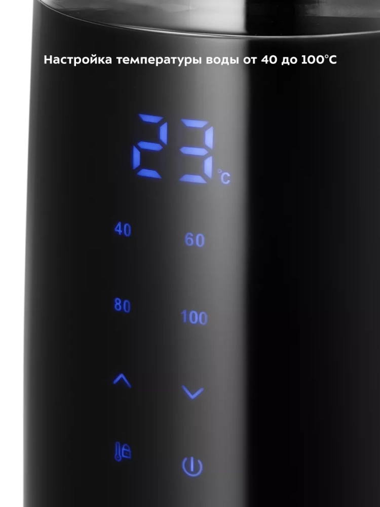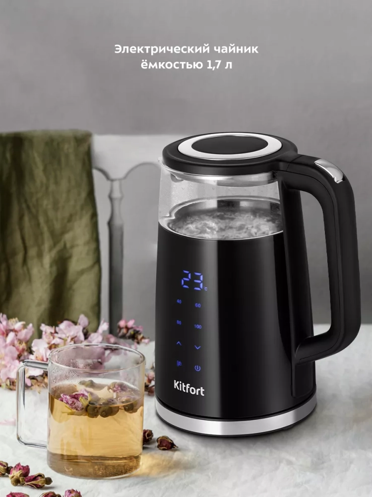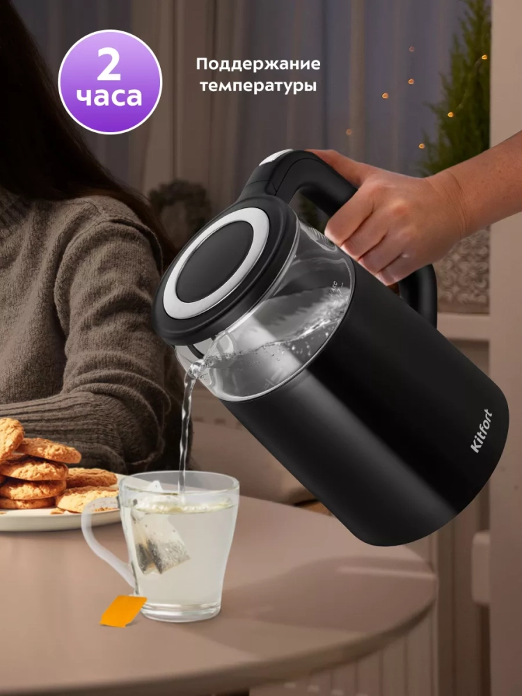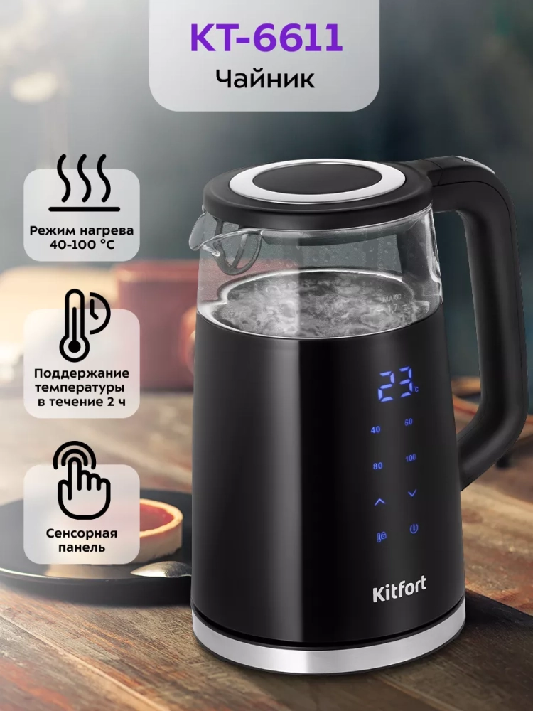 Электрический чайник с электронным терморегулятором Kitfort КТ-6611 может не только вскипятить воду, но и нагреть ее до температуры от 40 до 95 °С с шагом 5 °С, что очень удобно при заваривании различных сортов чая. Чайник также оснащен поддержания температуры в течение 2 часов с выбором поддержания температуры от 40 до 95 °С с шагом 5 °С. Температура воды контролируется встроенным в дно чайника термодатчиком.
