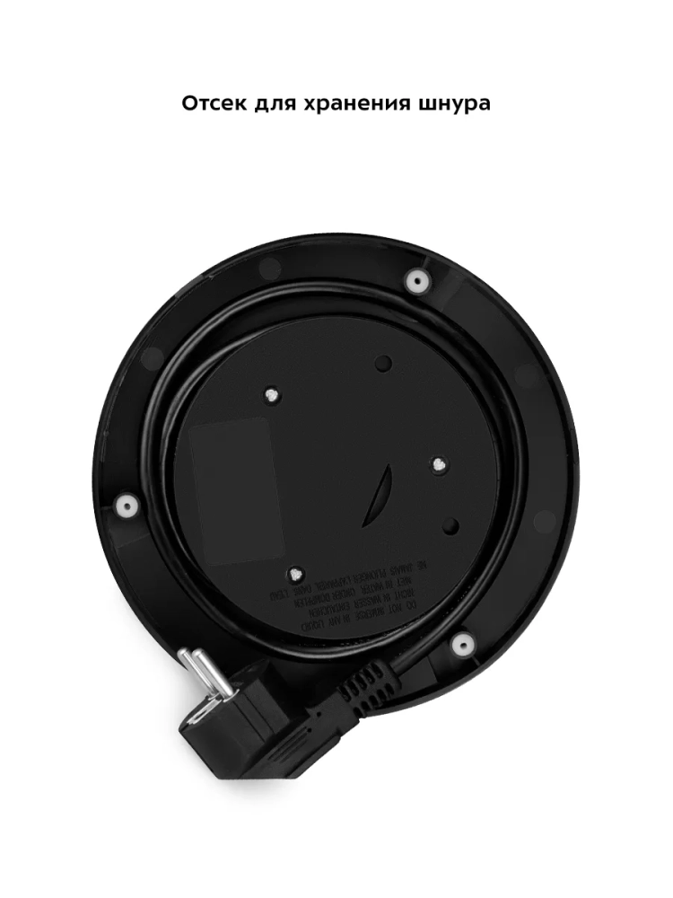 Подставка с центральным контактом дает возможность располагать на ней чайник в любом положении, обеспечивая вращение на 360°. На дне подставки имеется отсек для хранения шнура, чтобы излишки шнура не мешали на столе.