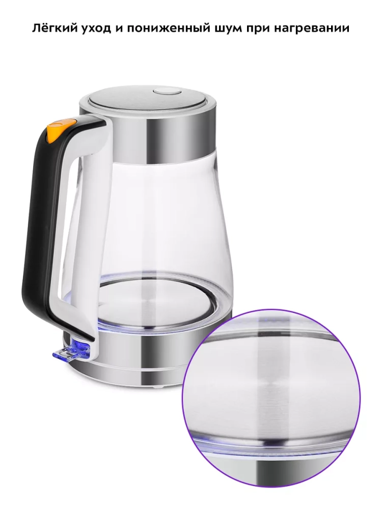 Корпус чайника выполнен из нержавеющей стали и стекла. Крышка и подставка выполнены из нержавеющей стали и пластмассы. Отметки «МАКС» и «МИН» нанесены на стеклянную часть чайника. Ручка чайника пластиковая, не нагревается и удобно лежит в руке. Внутренняя поверхность чайника полностью состоит из металла и стекла, благодаря чему вода не соприкасается с пластиком. При включении чайника загорается подсветка, которая является индикатором работы.