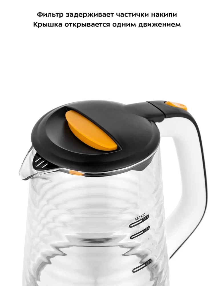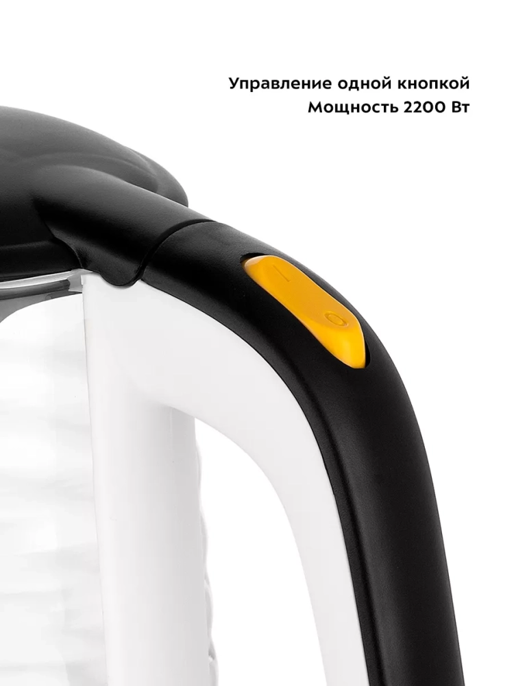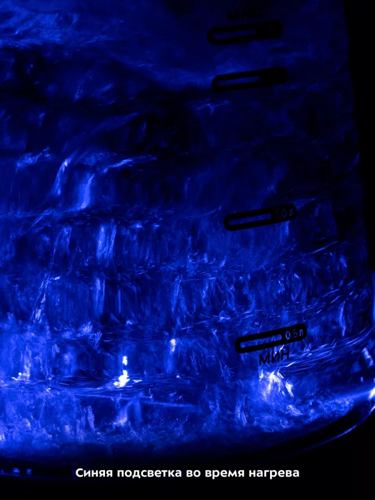 Корпус чайника выполнен из стекла и пластика. Мерная шкала нанесена на стеклянную часть корпуса. Ручка чайника пластиковая, не нагревается и удобно лежит в руке. При включении чайника загорается подсветка около дна прибора, которая является индикатором работы.
