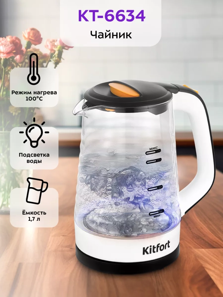 Электрический чайник Kitfort КТ-6634 предназначен для кипячения воды дома, в офисе, на даче.